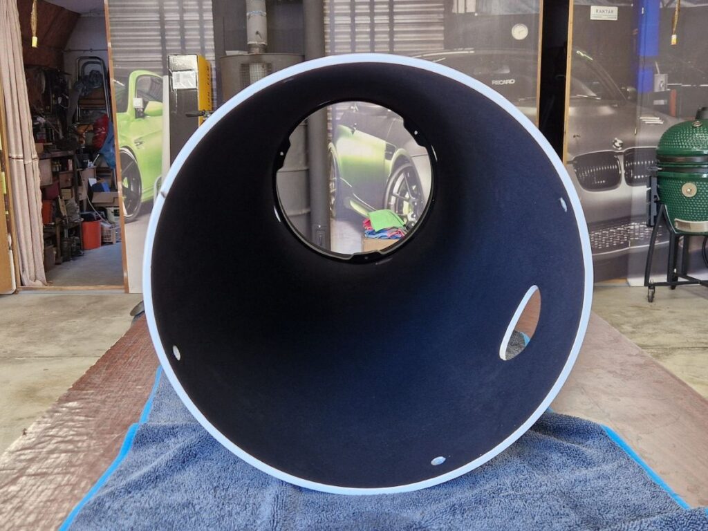 A tegnapi nap ismét jelentős lépéséhez érkezett el a nagy távcső projekt. Egy nagyon fontos munkafázist tekinthetek befejezettnek, a távcső belső mattítását, feketítését. A távcsöveket azért kell mattítani, hogy a tubus belső faláról össze-vissza verődő kósza fények az okulárba, vagy a detektorba jutva ne rontsák a jel/zaj viszonyt. Erre régen a mattfekete táblafesték szolgált, amit ecsettel hordtunk fel (sokan már nem tudják, mi az a tábla, vagy ha mégis, akkor a digitális tábla jut eszükbe. Pláne a táblakréta….). Ma már vannak alkalmasabb és tetszetősebb megoldások, mint pl. a különféle öntapadó dekorfóliák. Sok éves tapasztalat alapján én a dc-fix fekete velúrtapétáját használtam, mint tegnap kiderült, nem túl szakszerűen.
