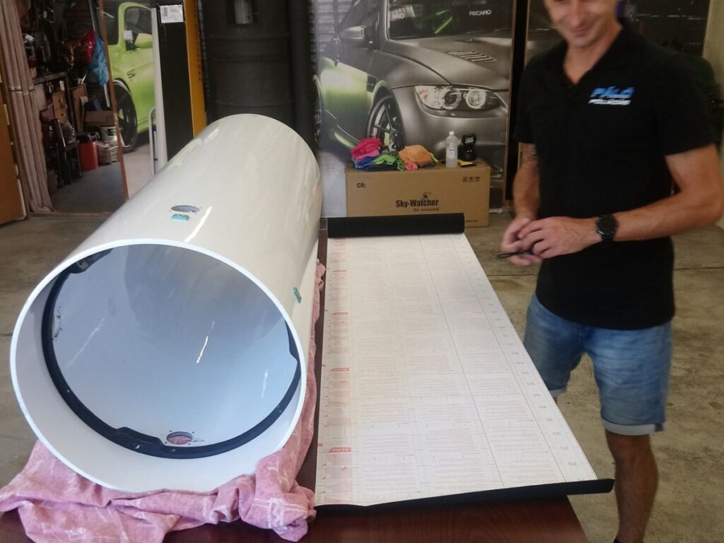 Egy véletlen folytán ismertem meg új amatőrcsillagász barátomat, Pálóczi Jánost, aki egészen véletlenül fóliázással foglalkozik. És bartereztünk egy kicsit. Én segítettem neki a távcsővel kapcsolatos technikai problémáiban, ő pedig a szombati pihenőnapját önzetlenül feláldozva, szakszerűen bebársonyozta az óriási távcsőtubust. A gyakorlott mozdulatai és a lélegzetelállítóan gyönyörű végeredmény rendkívüli szaktudásról árulkodnak. Ezúton is nagyon nagy hálával gondolok rá.