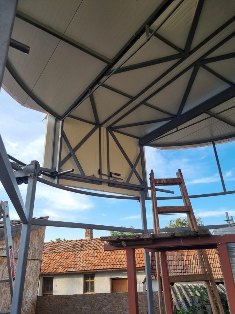 A kupola a helyére került, most látszik csak igazán milyen komoly, nagy szerkezet jött létre. A kupolát tartó görgők mellé került egy biztonsági támaszték is, amely, ha szükséges megtartja a teljes kupolát.